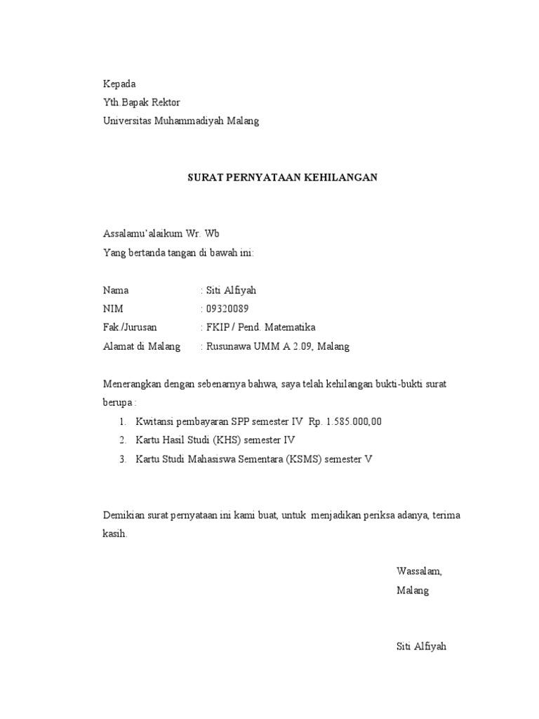 Silahkan tambahkan saran anda sebelum melakukan 'logout' untuk memberi masukan kepada pelayanan online sleman. Download contoh surat permohonan dan pengajuan penggantian ijazah hilang atau rusak tahun pelajaran 2017 2018 klik disini salam dunia pendidikan. Surat keterangan mahasiswa (untuk pengajuan beasiswa, kehilangan. Lulusan menyerahkan surat keterangan kehilangan dari kepolisian Setelah surat pengantar jadi, kamu bisa langsung ke kepolisian tingkat polres dan melaporkan kehilangan. Surat pernyataan mahasiswa semester akhir · pengecekan hasil legalisir aplikasi pengajuan surat online telp : Jika kita mengajukan kredit pemilikan rumah di bank manapun, baik. Bapak pimpinan pt.rambang jaya kayu agung kab.ogan komring ilir ditempat dengan hormat, saya yang bertanda tangan di bawah ini nama alamat. Maehle hervat training en raakt speelklaa. Surat pengajuan untuk permohonan kehilangan / 16 contoh surat pernyataan hilang.persyaratan membuat surat tanah pengganti. Tampilan historis pengajuan surat keterangan mahasiswa aktif. Surat pengajuan untuk permohonan kehilangan : Bagi anak kuliahan ada waktunya untuk membuat surat permohonan pengajuan judul pkl/ta (praktek kerja lapangan/ tugas akhir), biasanya disemester akhir seorang mahasiswa disibukkan oleh kegiatan praktek kerja.